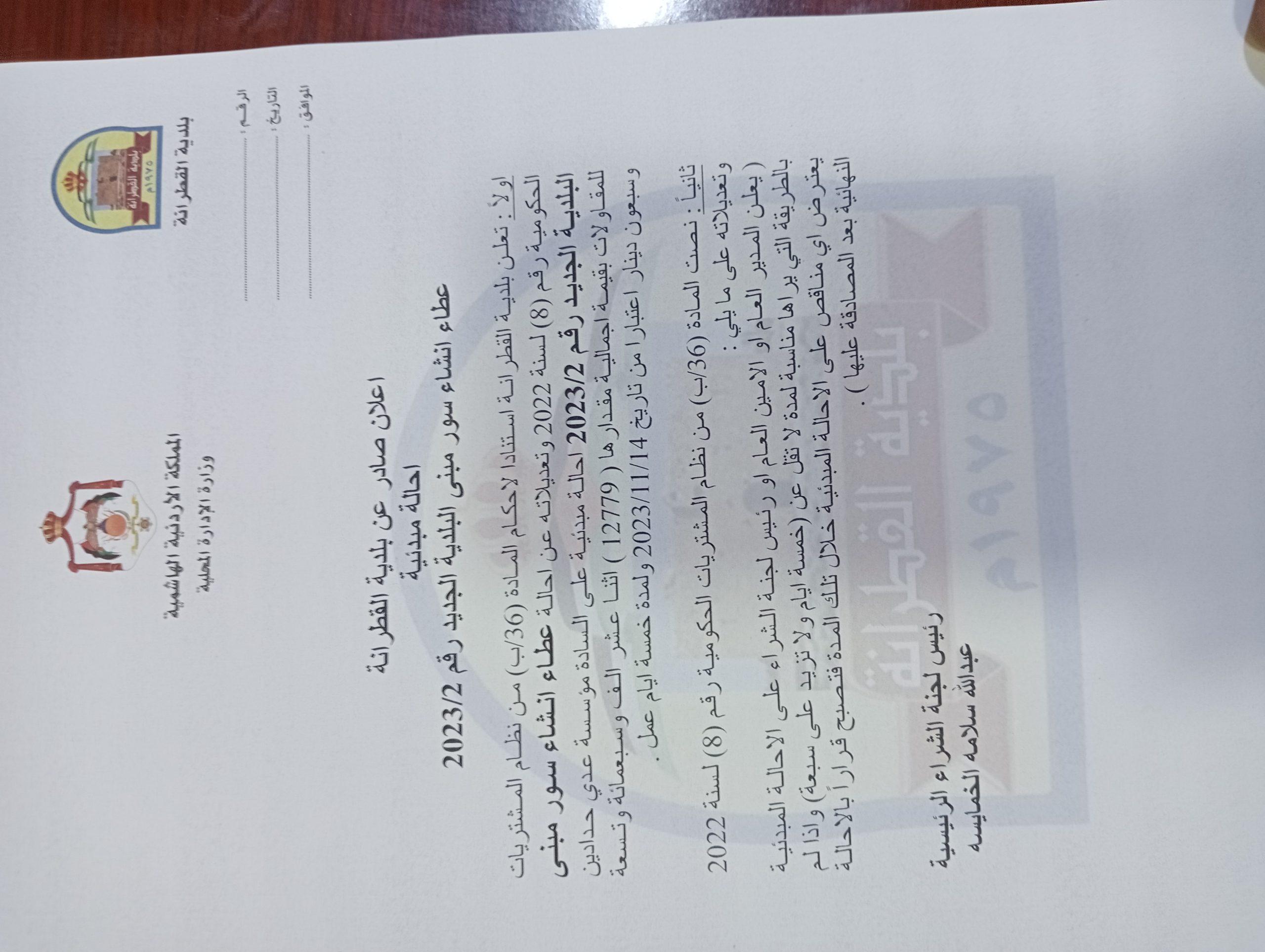 اعلان احاله مبدئية عطاء انشاء سور لمبنى البلدية الجديد رقم 2/2023