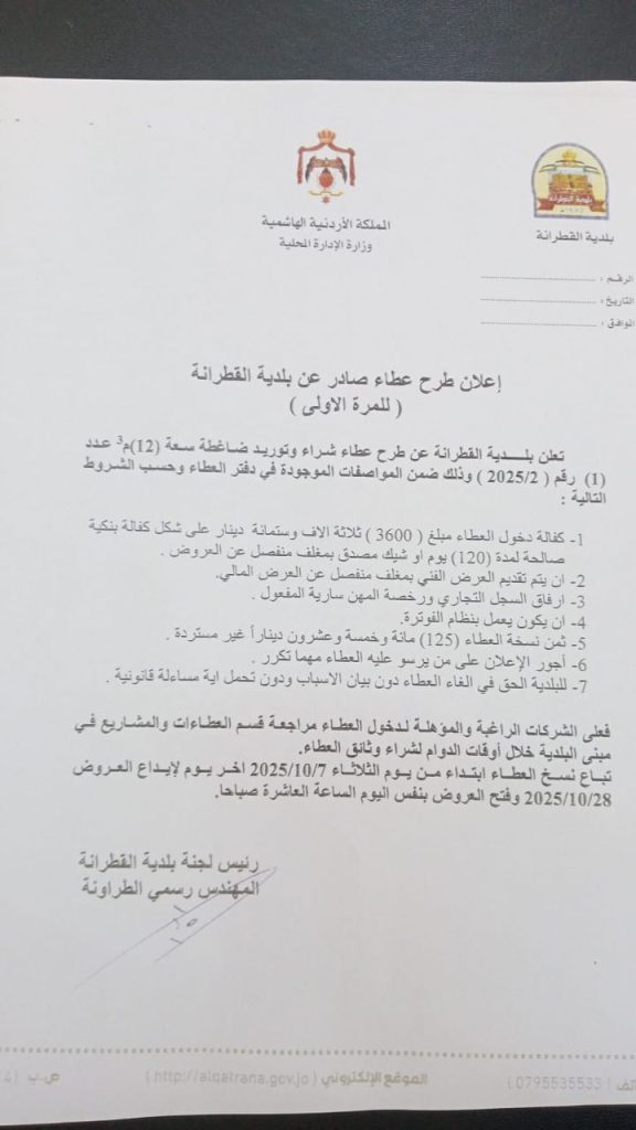 اعلان طرح عطاء شراء وتوريد ضاغطة سعة ١٢ متر مكعب للمرة الأولى