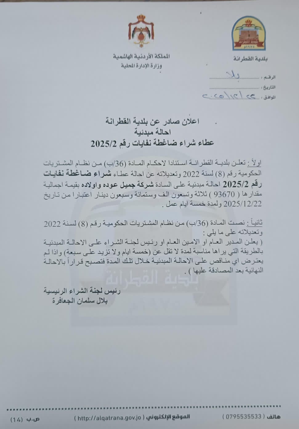 اعلان احالة مبدئية عطاء شراء ضاغطة نفايات رقم 2/2025