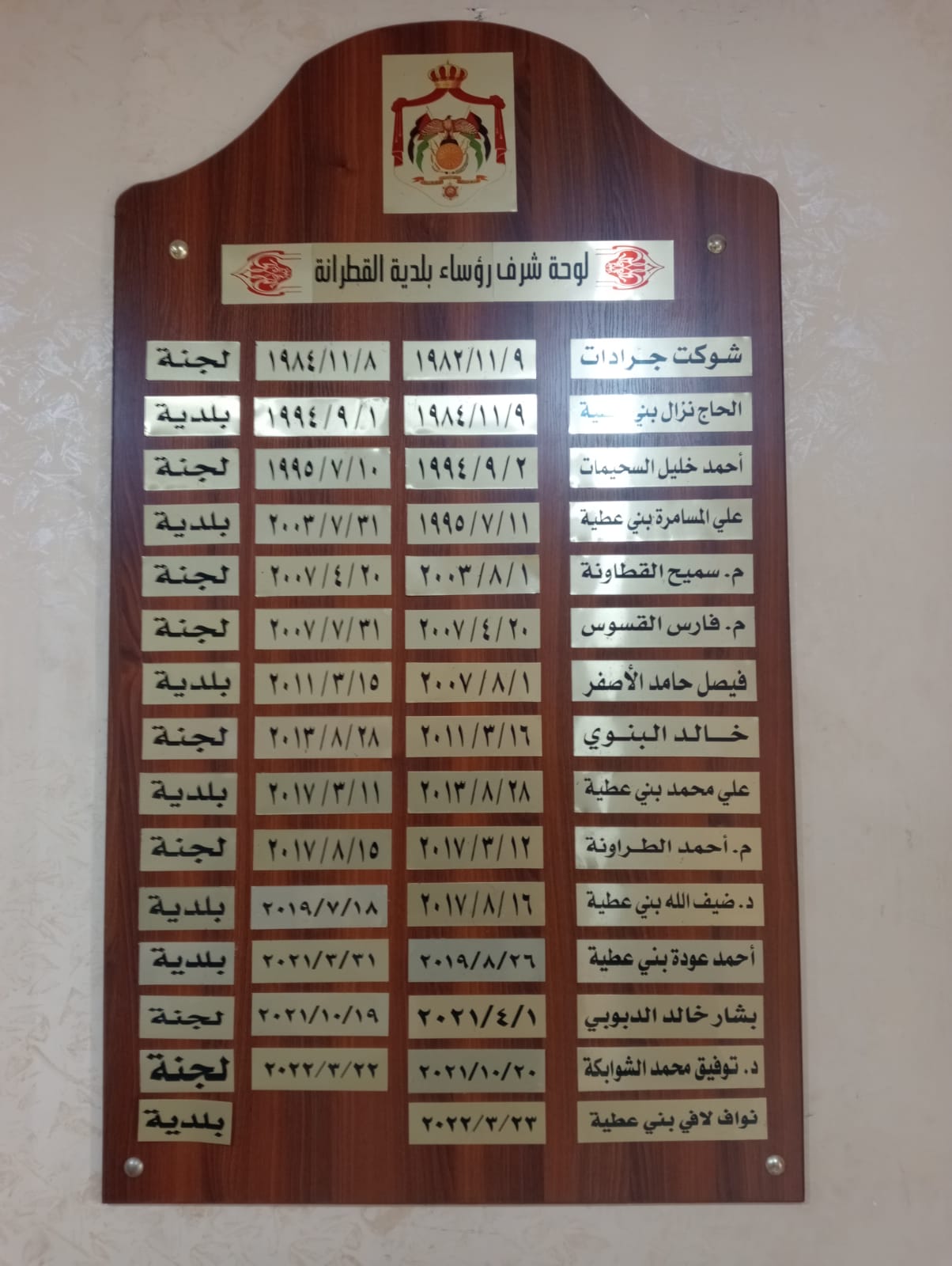 | أحمد عوده بني عطية | 26/8/2019 | 31/3/2021 | بلدية |